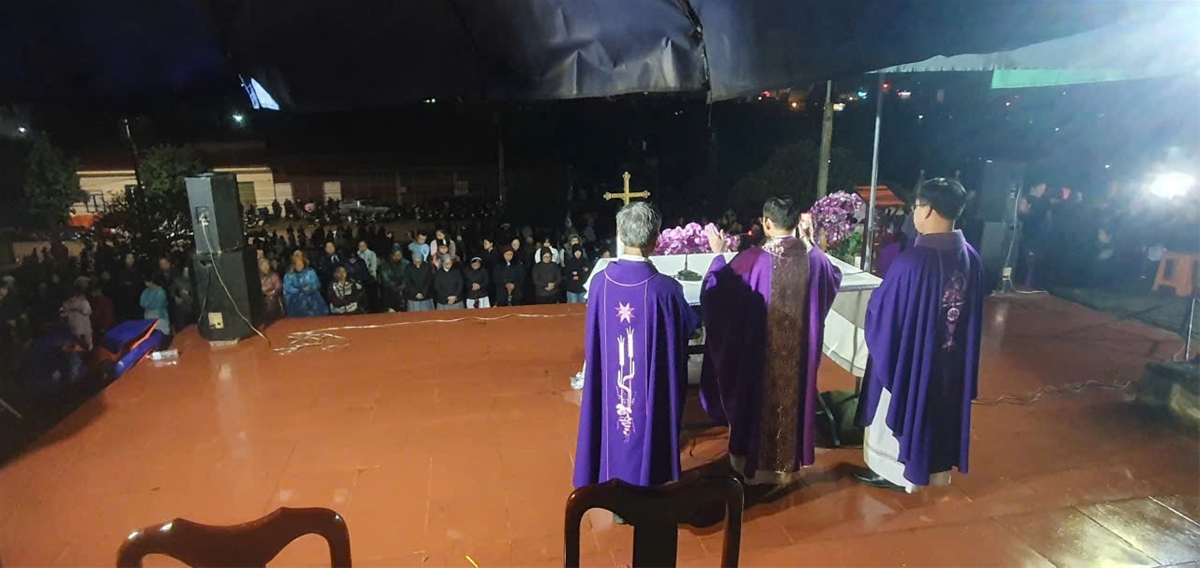 Thánh lễ diễn ra lúc 18g45 trong bầu khí linh thiêng và sốt sáng với đèn hoa lung linh. Thánh lễ do cha Phaolô Nguyễn Văn Thảo (chính xứ Ngạn Sơn) chủ tế, cùng đồng tế với ngài có quý cha trong Giáo xứ Mỹ Sơn. Quý nam-nữ tu sĩ cùng cộng đoàn dân Chúa sốt sáng tham dự.