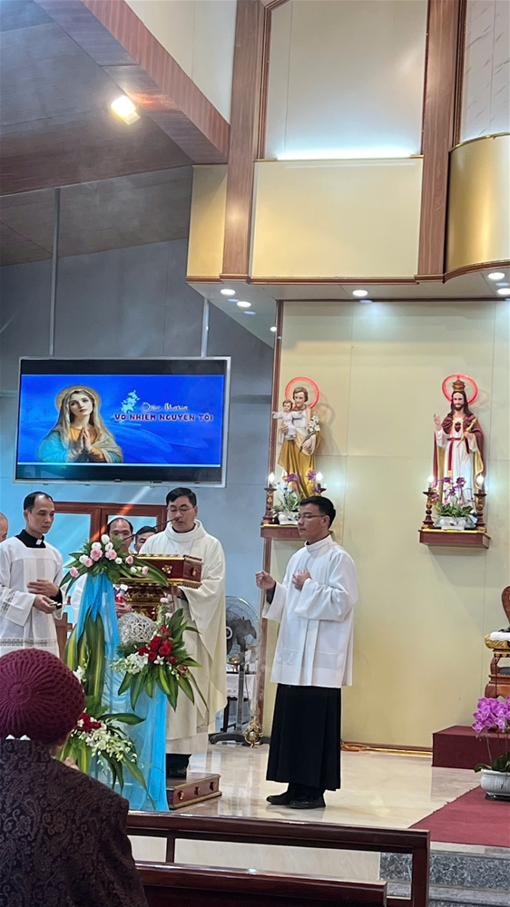 Đúng 10g00, cộng đoàn long trọng bước vào Thánh lễ mừng kính Đức Maria Vô Nhiễm Nguyên Tội, do cha quản hạt – Đại diện Giám mục miền Cao Bằng – Tôma Aq. Ngô Văn Khảo, chánh xứ Thanh Sơn, chủ tế. Đồng tế với ngài có quý cha trong hạt, cùng sự hiện diện đông đảo của quý tu sĩ, chủng sinh, cộng đoàn dân Chúa và anh chị em hội viên Legio Mariae từ các giáo xứ trong vùng.