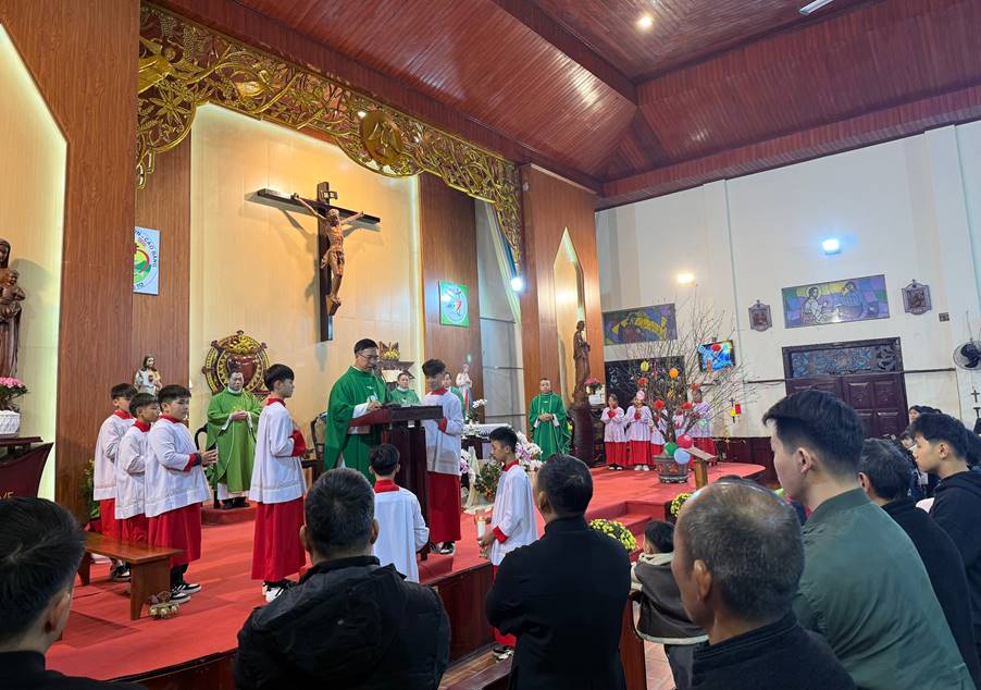 Mở đầu Thánh lễ, Đức cha Giuse chia sẻ cách đơn sơ nhưng sâu lắng: “Hôm nay tôi vui mừng đến thăm anh chị em, ăn tết sớm với anh chị em, và nhất là cùng với anh chị em gặp gỡ Chúa trong Thánh lễ này. Chúng ta cùng tạ ơn Chúa vì biết bao ơn lành hồn xác Ngài đã ban cho chúng ta trong suốt năm qua. Mọi sự ta có đều bởi ơn Chúa.”