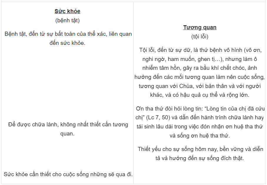 Lành bệnh và tha thứ đều quan trọng cho sự sống con người: lành bệnh liên quan đến sức khỏe; tha thứ liên quan đến tương quan với Thiên Chúa, với bản thân và với người khác. Con người không thể sống bình an, thậm chí sống mà như chết, nếu những tương quan này bị tổn thương.