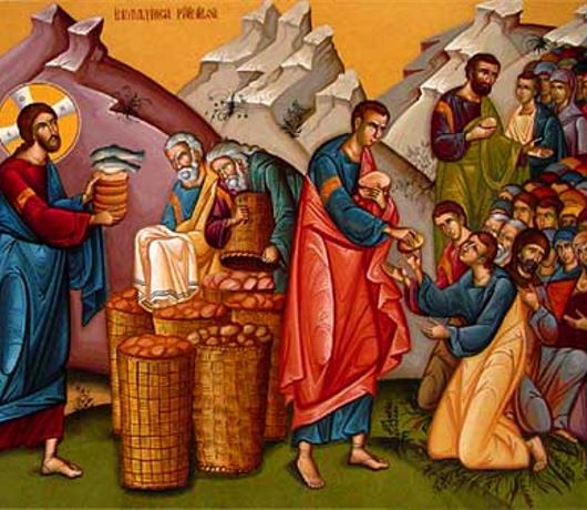 Một trong những môn đệ, tên là Anrê, em ông Simon Phêrô, thưa cùng Người rằng: "Ở đây có một bé trai có năm chiếc bánh lúa mạch và hai con cá, nhưng bấy nhiêu thì thấm vào đâu cho từng ấy người". Chúa Giêsu nói: "Cứ bảo người ta ngồi xuống". Nơi đó có nhiều cỏ, người ta ngồi xuống, số đàn ông độ năm ngàn. Bấy giờ Chúa Giêsu cầm lấy bánh và khi đã tạ ơn, Người phân phát cho các kẻ ngồi ăn, và cá cũng phân phát như thế, ai muốn bao nhiêu tuỳ thích. Khi họ đã no nê, Người bảo các môn đệ: "Hãy thu lấy những miếng còn lại, kẻo phí đi". Họ thu lại mười hai thúng đầy bánh vụn do năm chiếc bánh lúa mạch người ta đã ăn mà còn dư.